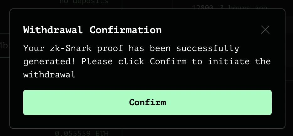 使用您的存款注释,将其粘贴到相应的框中。单击“提款”并等待生成 zk-Snark 证明。